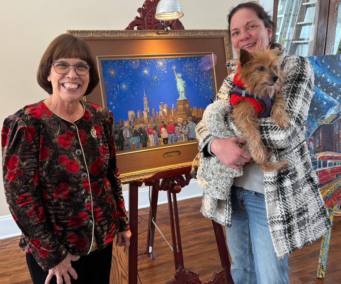 “Our Lady of Liberty” is Barnicott’s work. However, she localized the painting by using images of Pittsburgh notables as well as Bethel Park citizens. Alongside Pittsburgh icons such as Andrew Carnegie, August Wilson and Fred Rogers are Bethel Park citizens such as library director Christine McIntosh, historical society president Tim Moury, community foundation Vice President Andy Amrhein, Rotary Club member Russ Spicuzza, Reginald Coffee owners Matt and Julie Koczko as well as Laura Codori and her dog, Ginger.