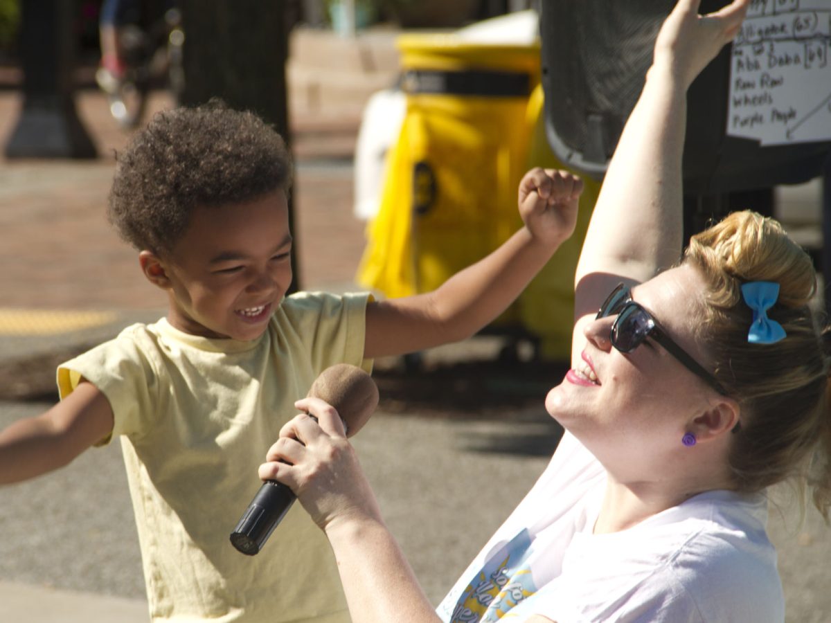 Val Williams teams with a singing youngster during a “Songs for Young Whippersnappers” performance at Pittsburgh’s Market Square.