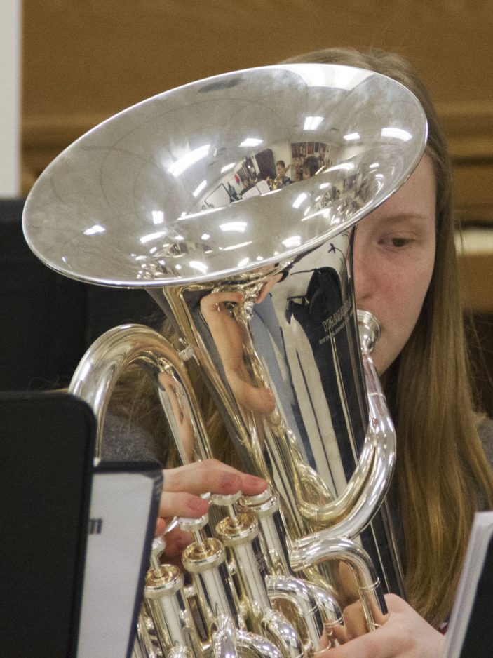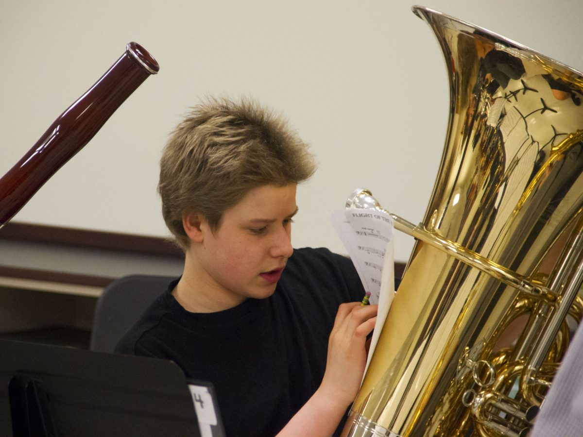 Tuba player Colby Bernard takes notes during Jason Worzbyt’s instruction.