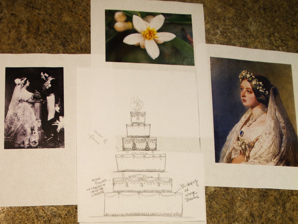 Katlyn Doolin made a sketch of the cake as a guide, using elements from the 1840 wedding of Queen Victoria and Albert of Saxe-Coburg and Gotha.
