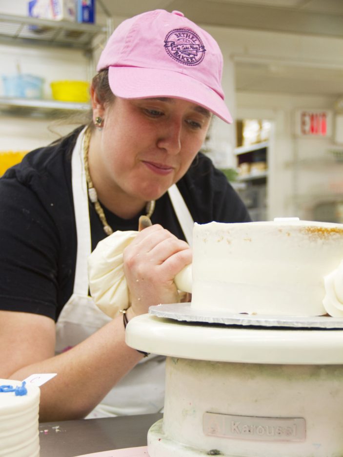 An employee of Bethel Bakery decorates a cake.