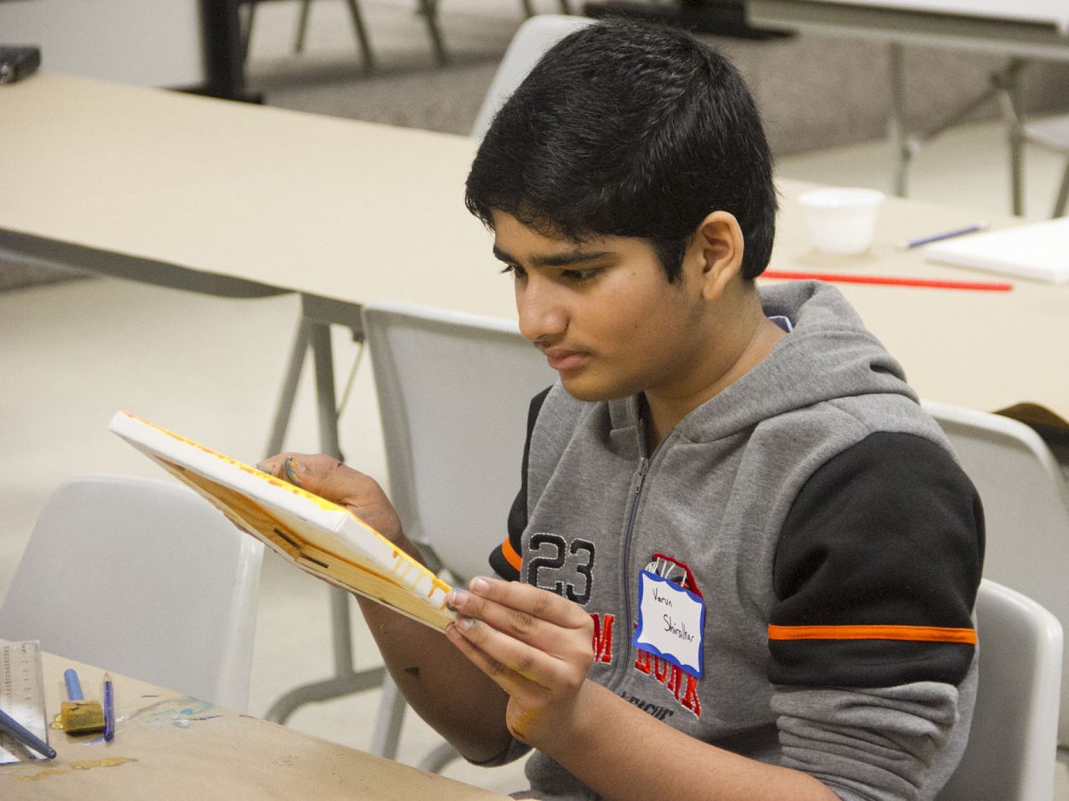 Selva Priya puts finishing touches on her painting during the class at South Fayette Township Library.