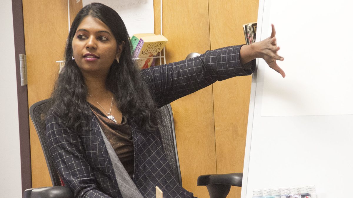 At the start of her art class, Selva Priya describes what eventually will be portrayed.