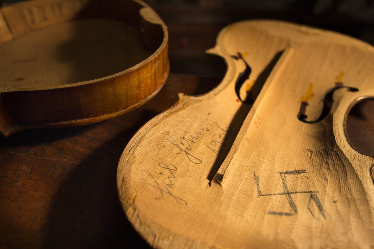 Violins on displayMan’s inhumanity toward man is exemplified in one of the instruments called “The Heil Hitler Violin,” and owned by a Jewish musician who needed repair work done. He took it to a shop and, unbeknownst to the owner, the violinmaker secretly opened it up and inscribed on it a swastika and Heil Hitler, 1936. A violinmaker from Washington, D.C., had purchased the instrument and was aghast when he found the inscriptions. His first instinct was to bury it, but he instead donated it when he found out about the Violins of Hope project. It will never be played again.