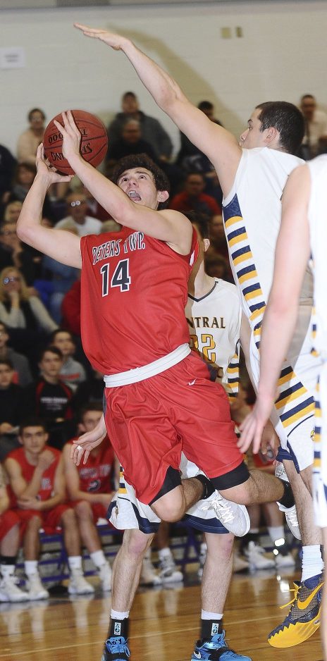 The Indians fell behind early and fell short of recovering. With Peters Township owning its only lead, 7-6, the Vikings went on a 13-point run forge ahead, 19-7, by the end of the first frame. They never trailed, opening up 34-19 advantage before Nick Valentic and Mike Cortese buried 3-point field goals. Central expanded a halftime lead of 38-25 to 56-44 with six minutes to play when Peters waged a comeback, thanks to its full-court pressure.