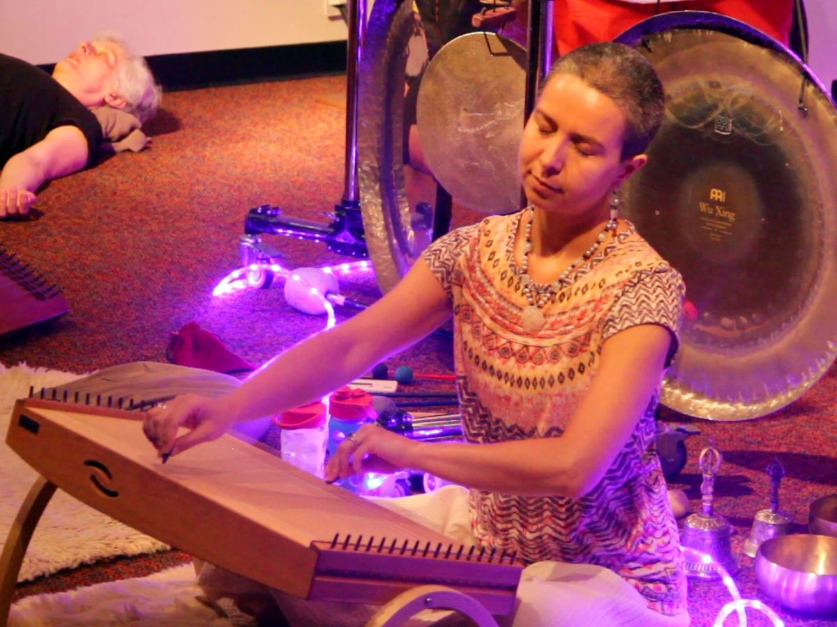 The musical performance began with Mike on hammered dulcimer and Gallina playing monochord, a 34-string instrument that produces tones reminiscent of a sitar, as she provided relaxation suggestions in a soothing manner.
