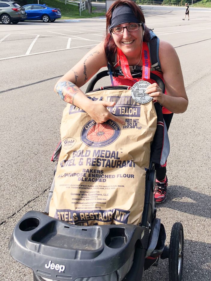 “Fifty pounds is the official amount of weight that I’ve lost and kept off, for a whole year,” she explained about the sack she pushed the entire three-plus miles. “It has been gone and stayed gone, so we’re going to try to keep it that way.”