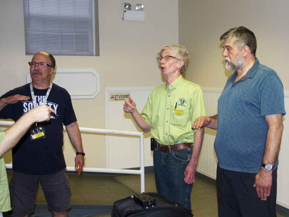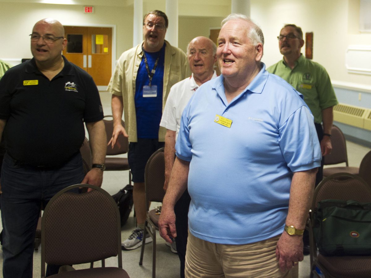 From left, Mark Schroeder and Ken Dobbins, Keystone Chorus president, try to help teach a thing or two to a visiting journalist. (Photo by Bob Seeger)