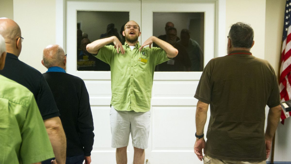 George Fritsch and other group members participate in warmups prior to singing at rehearsal.