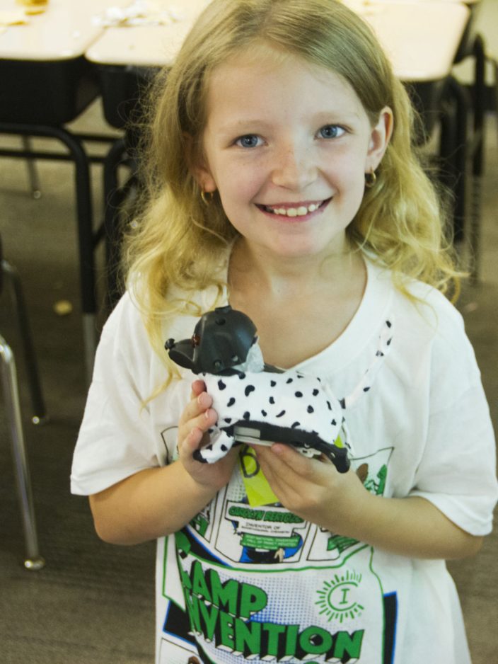 A Camp Invention participant shows off her “Robotic Pet Vet” miniature dog.