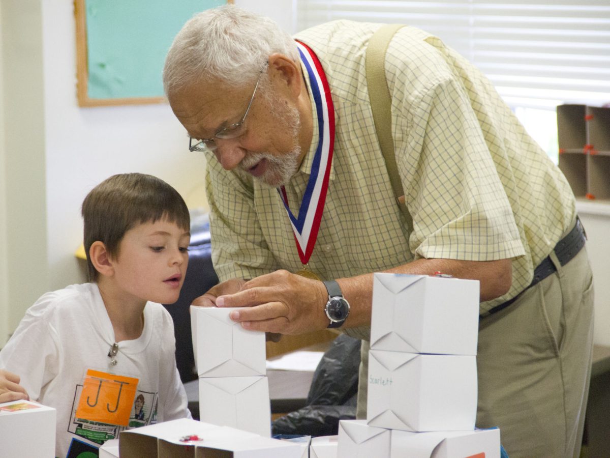 Alois Langer takes a close look at a Camp Invention participant’s “Mod My Mini Mansion” project at Neil Armstrong Elementary School.