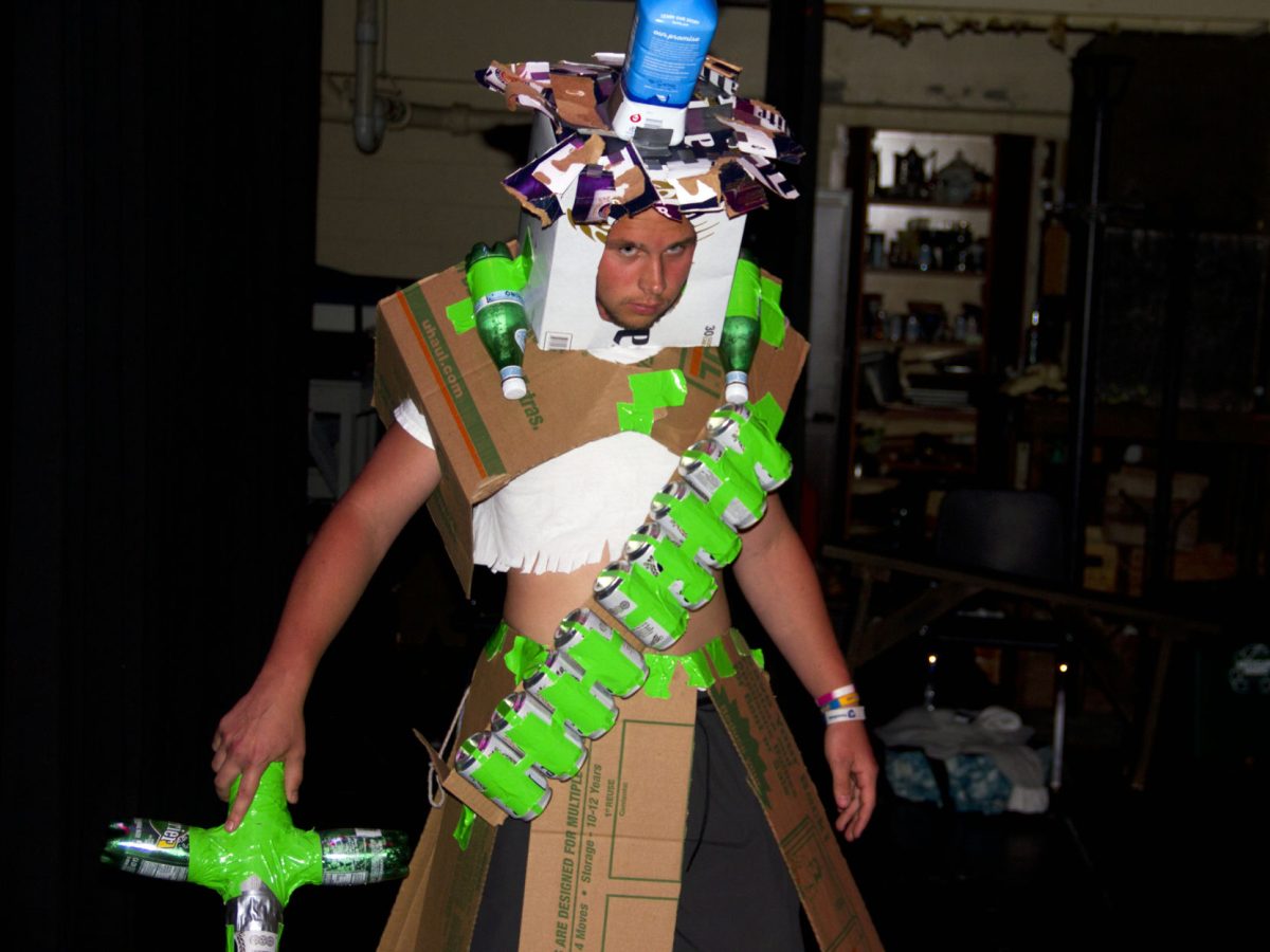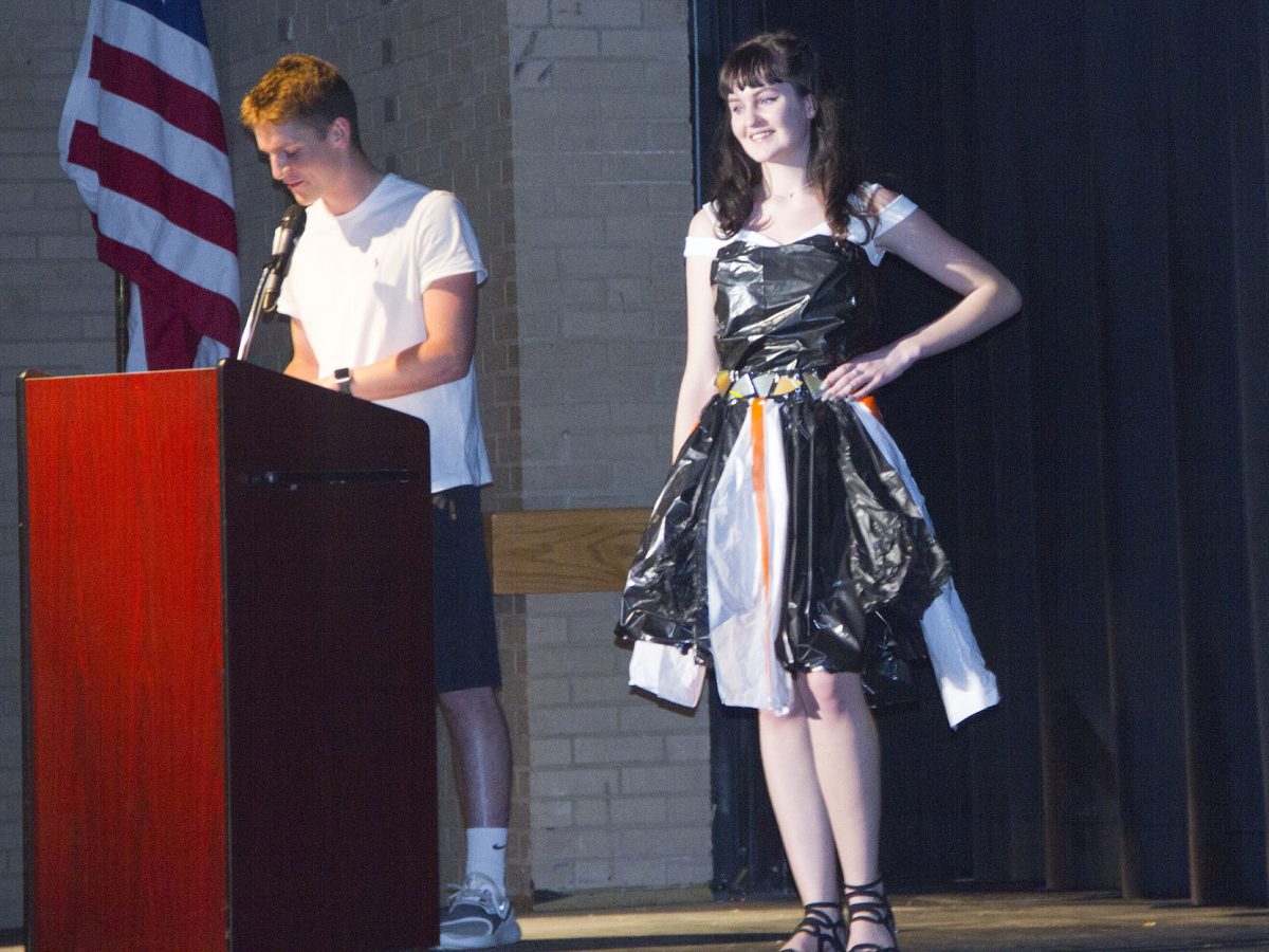 Advanced placement environmental science students did their own take on the climactic sequence of the fashion-industry spoof “Zoolander” by putting on what they call the TRASHion Show, strutting across the school auditorium’s stage in outfits made of recycled or discarded materials.