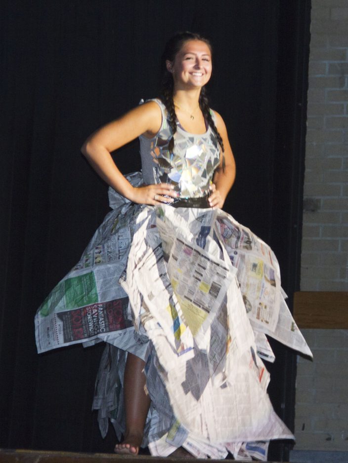 “We thought that the CDs would look really cool with the lights because of the reflection,” she said. “We wanted a big skirt to show and look like a prom dress, so we thought the newspapers would be a good touch.”