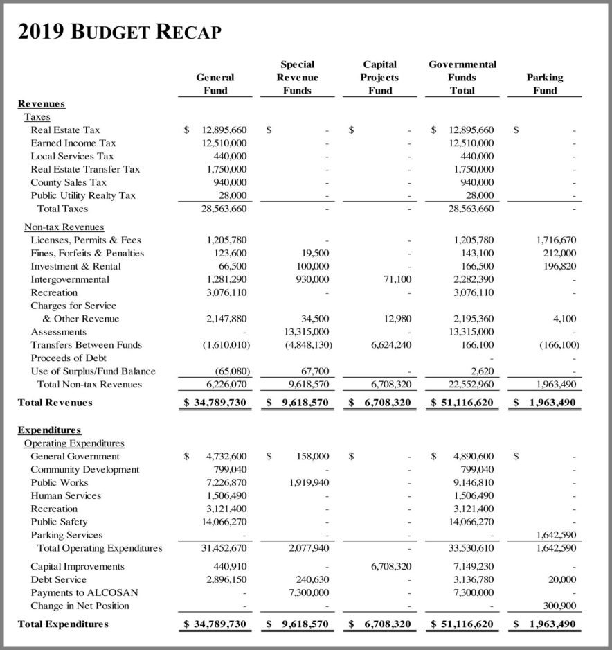 The recommended operating budget for Allegheny County’s third-largest municipality by population totals $33.5 million, with expenditures that actually amount to about $100,000 less than the current year.