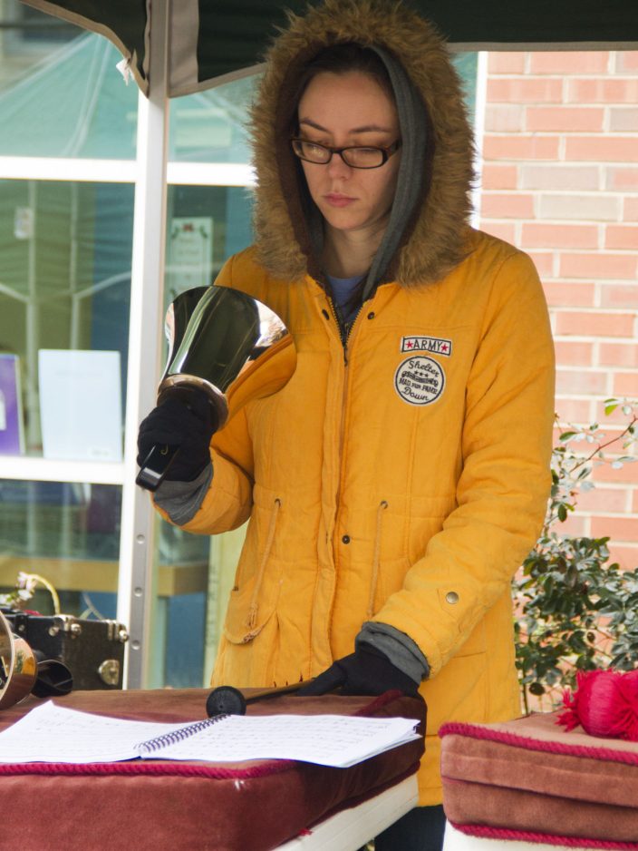 Ringers 2, primarily middle school-aged students, is directed by Elizabeth Peters, who also does a lot of composition for the various ringing groups. Essi Efthimiou, Pinkerton’s wife, directs Ringers 3, which provides students in fourth through eighth grades with the opportunity to learn handbells.
