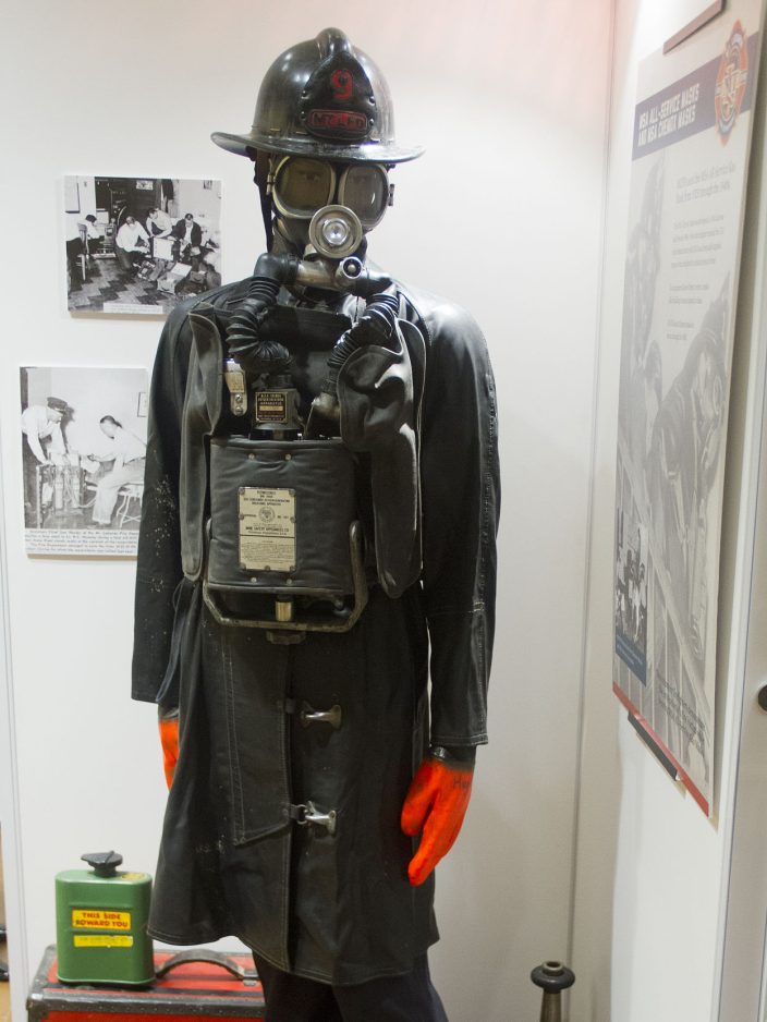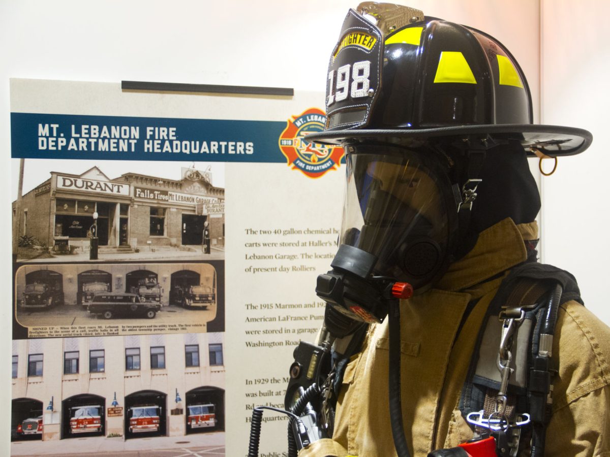 A look at what a firefighter wore a century ago is part of the history center exhibit “Mt. Lebanon’s Fire Department: 100 Years of Serving the Community.”