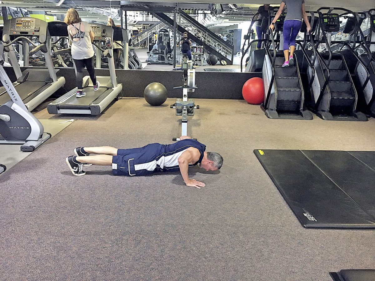 Larry Lehman does pushups Sept. 16 to raise funds for Rotary.