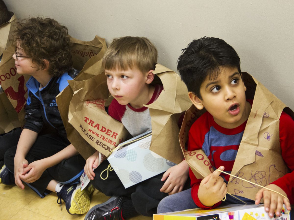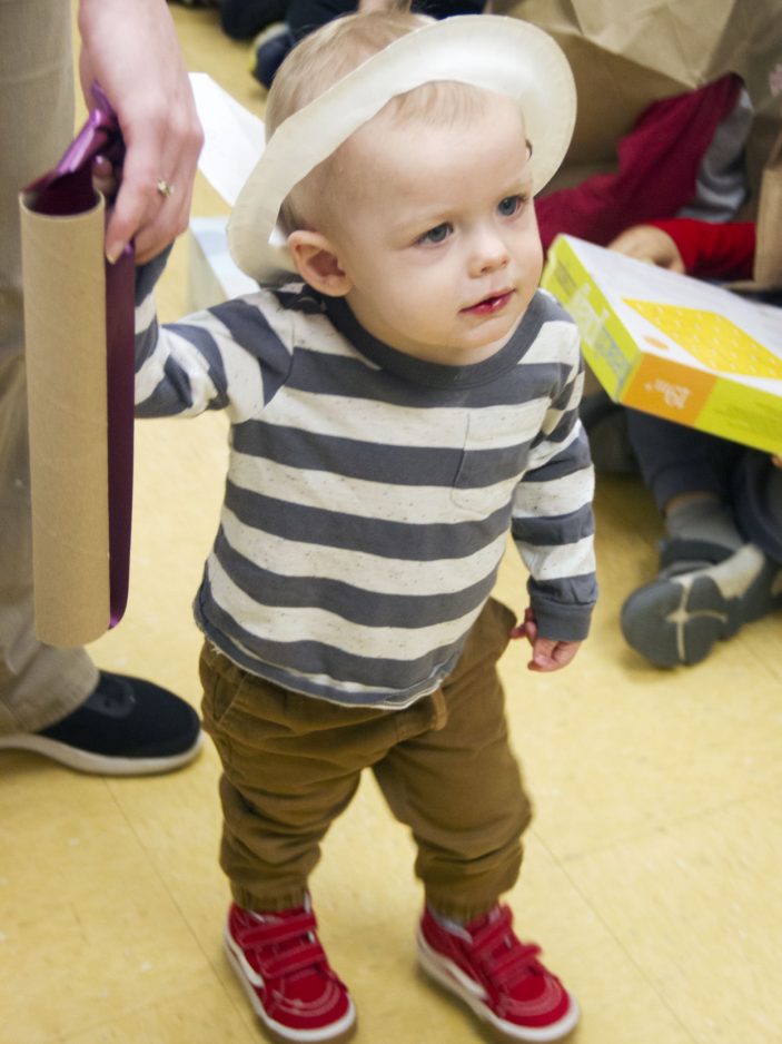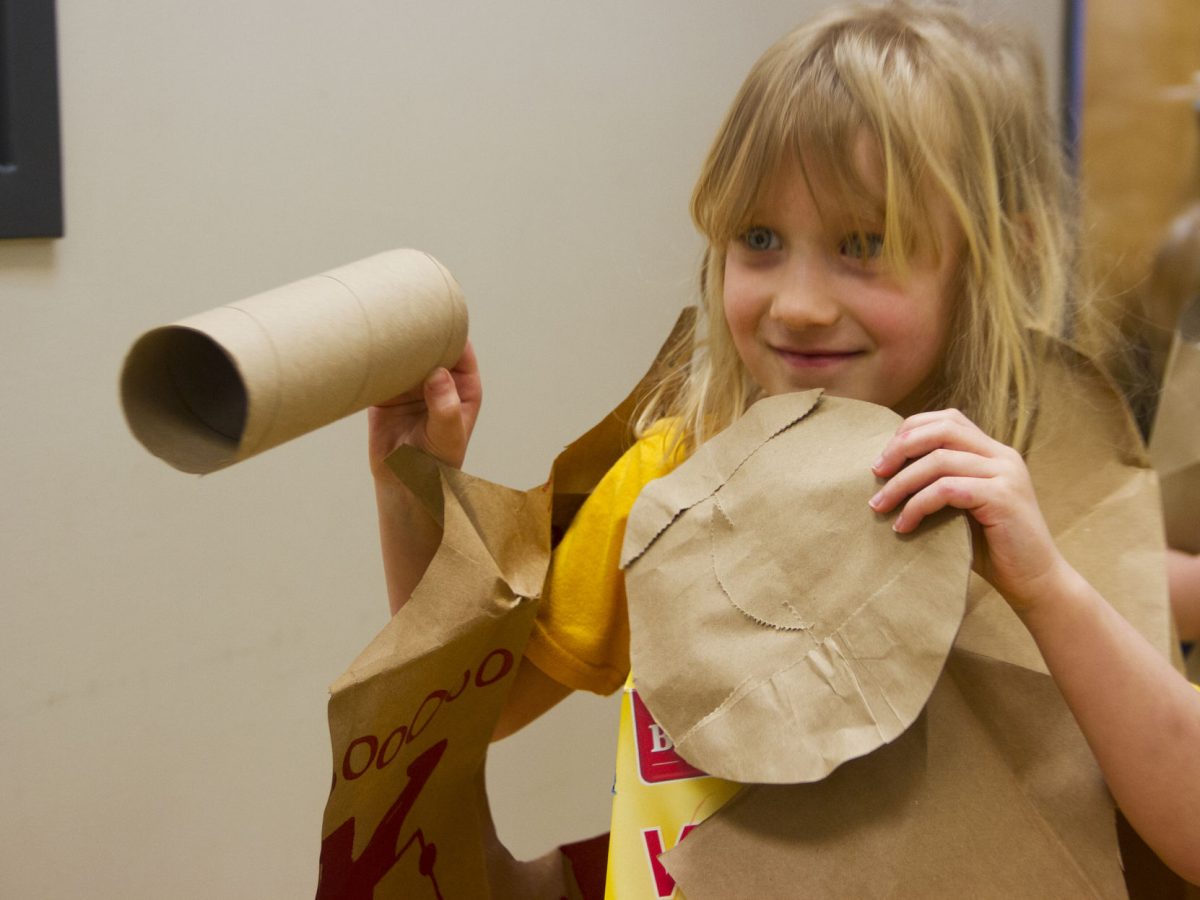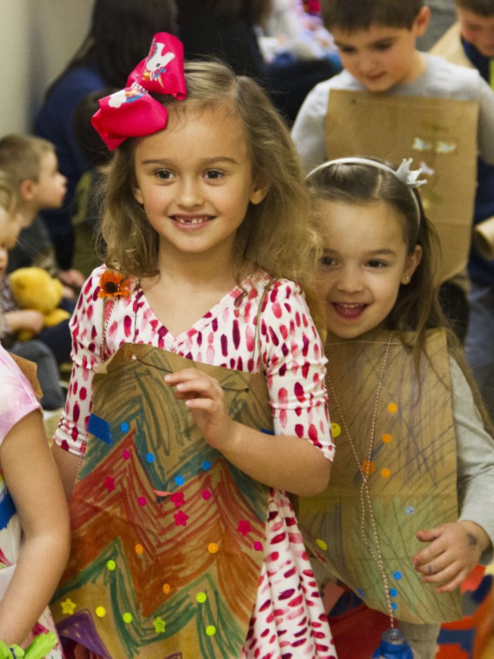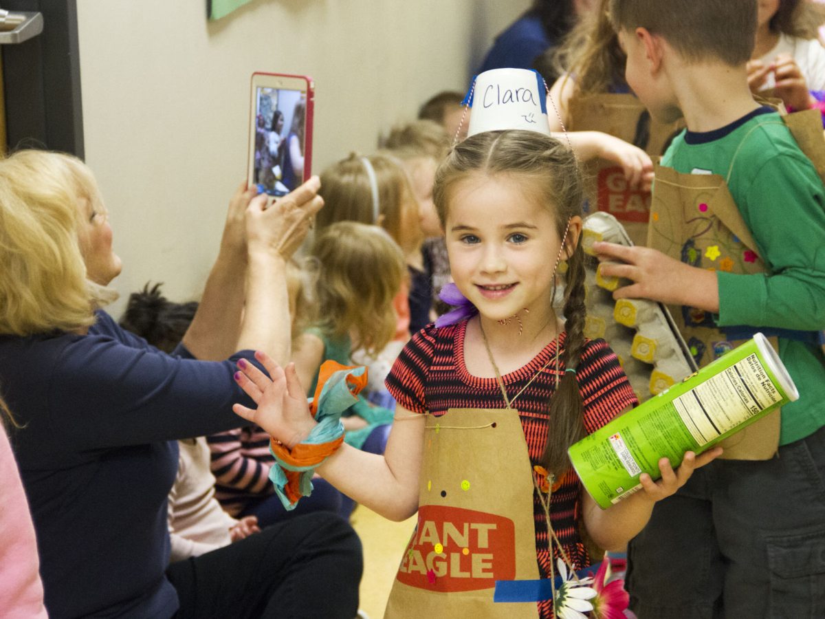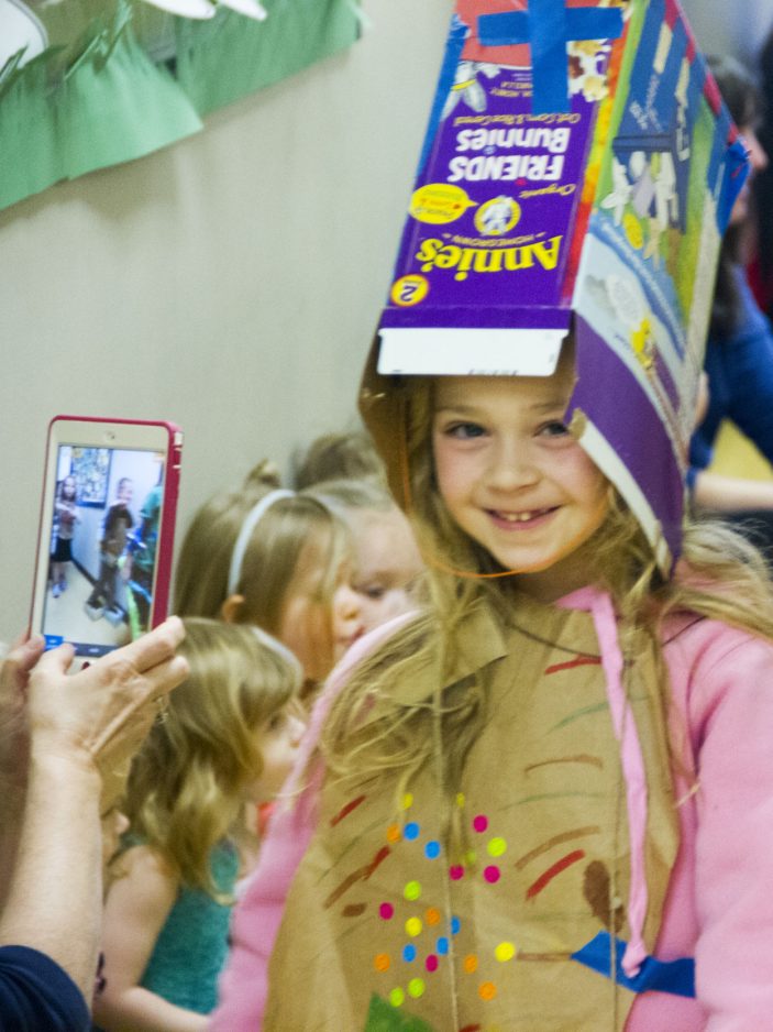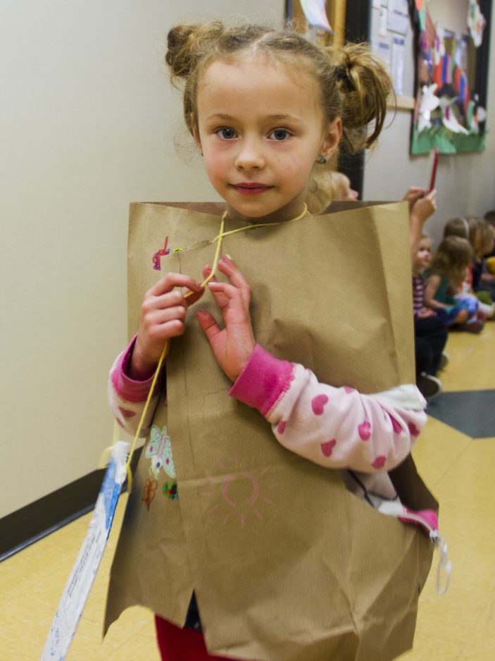 The culminating activity was the students’ own fashion show, with children modeling the likes of decorated paper grocery bags as aprons, styrofoam containers as hats and cardboard boxes and purses.