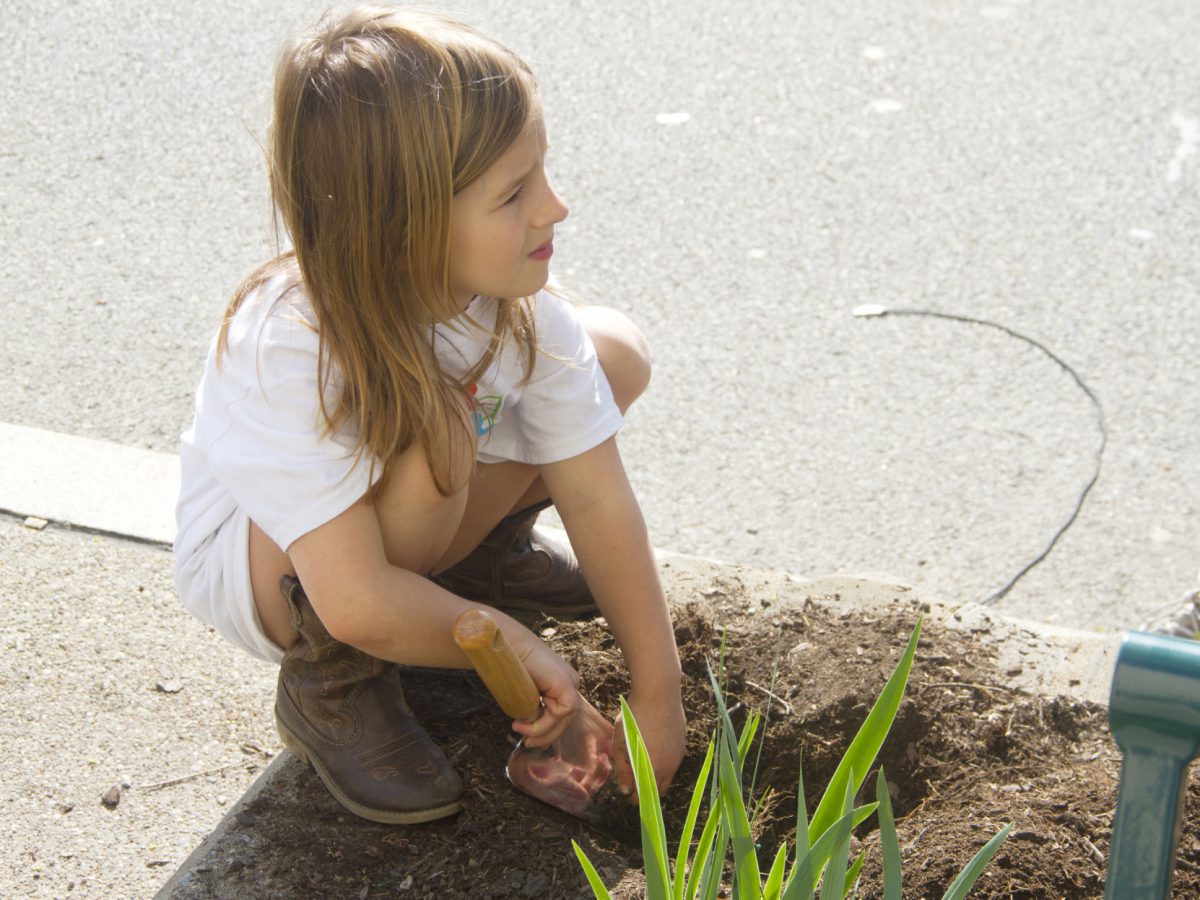 Ella Svitek helps with last year’s planting to beautify Washington Road.