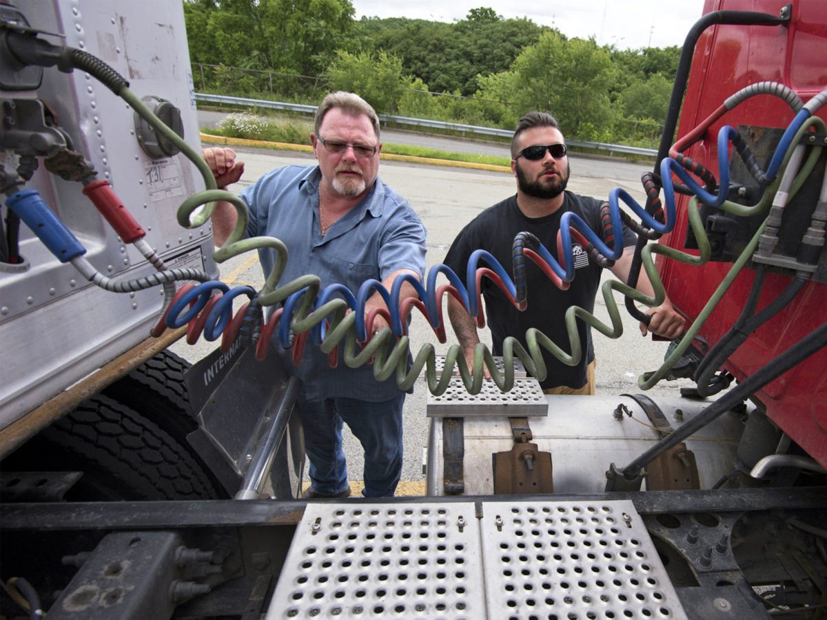 Benjamin Crawford, left, a commercial driver’s license instructor at Penn Commercial in Washington, checks a truck with student Chris Schultz.