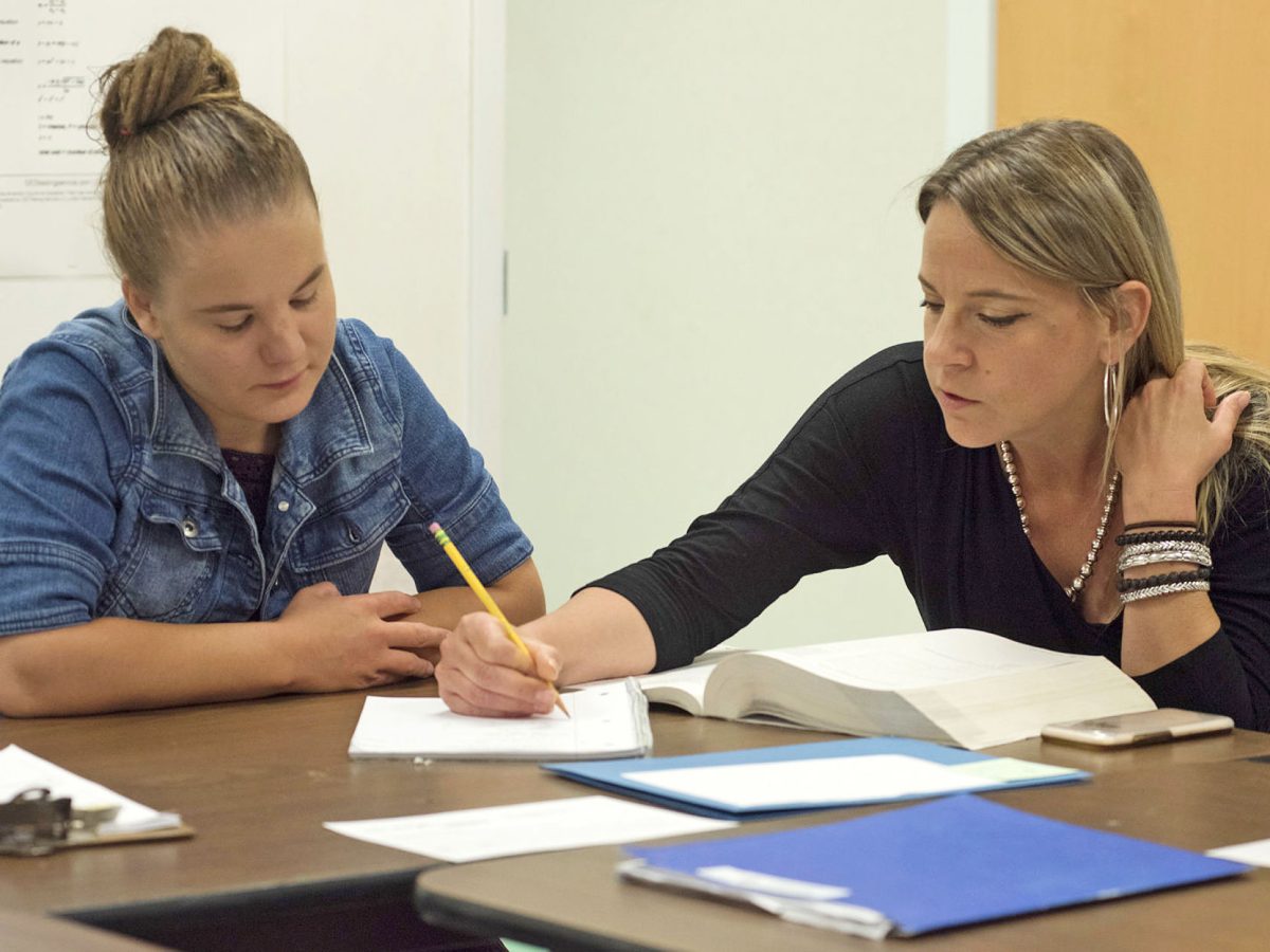 Instructor Jill Casey, right, works with Ashley Washabaugh of Washington as she studies for her GED at Penn Commercial in Washington.