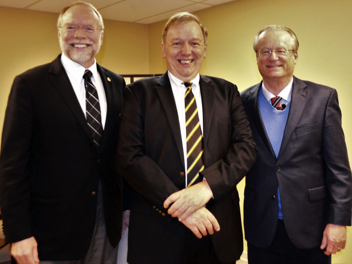 Andy Masich, left, president and chief executive officer of the Senator John Heinz History Center, greets Mike Suley, center, and James R. Hansen for the “Destination Moon: The Apollo 11 Mission” exhibit.