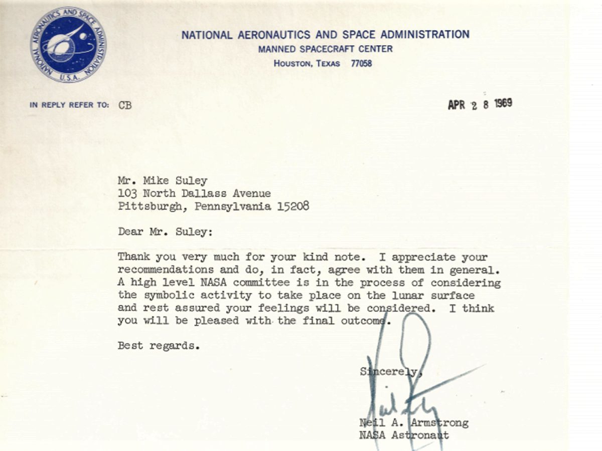 “I appreciated your recommendations and do, in fact, agree with them in general,” Armstrong wrote in response to Suley. “A high level NASA committee is in the process of considering the symbolic activity to take place on the lunar surface and rest assured your feelings will be considered. I think you will be pleased with the final outcome.”
