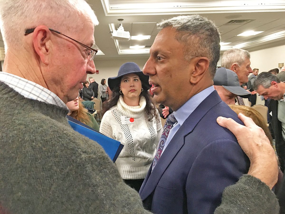 Greg Smith of Pleasant Hills, left, congratulates candidate D. Raja, who won a majority of GOP delegates’ votes.