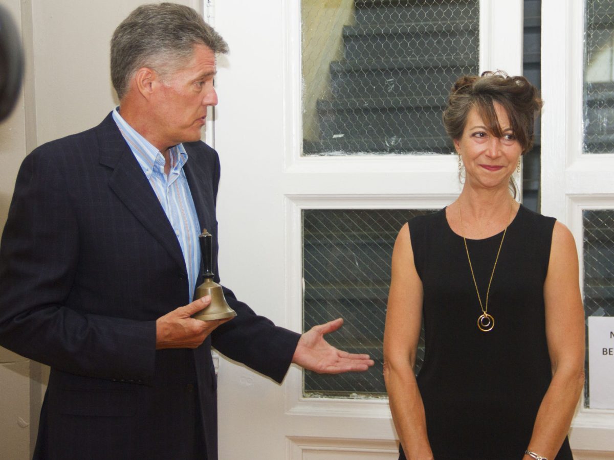 Bill Haberthur congratulates Janet Furtney during the Improvement thru Movement reception at the Schoolhouse Arts and History Center.