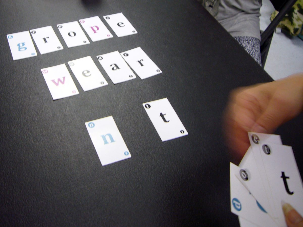 Player One then places cards on the table to spell a word in English, no proper names or contractions, with another caveat:
