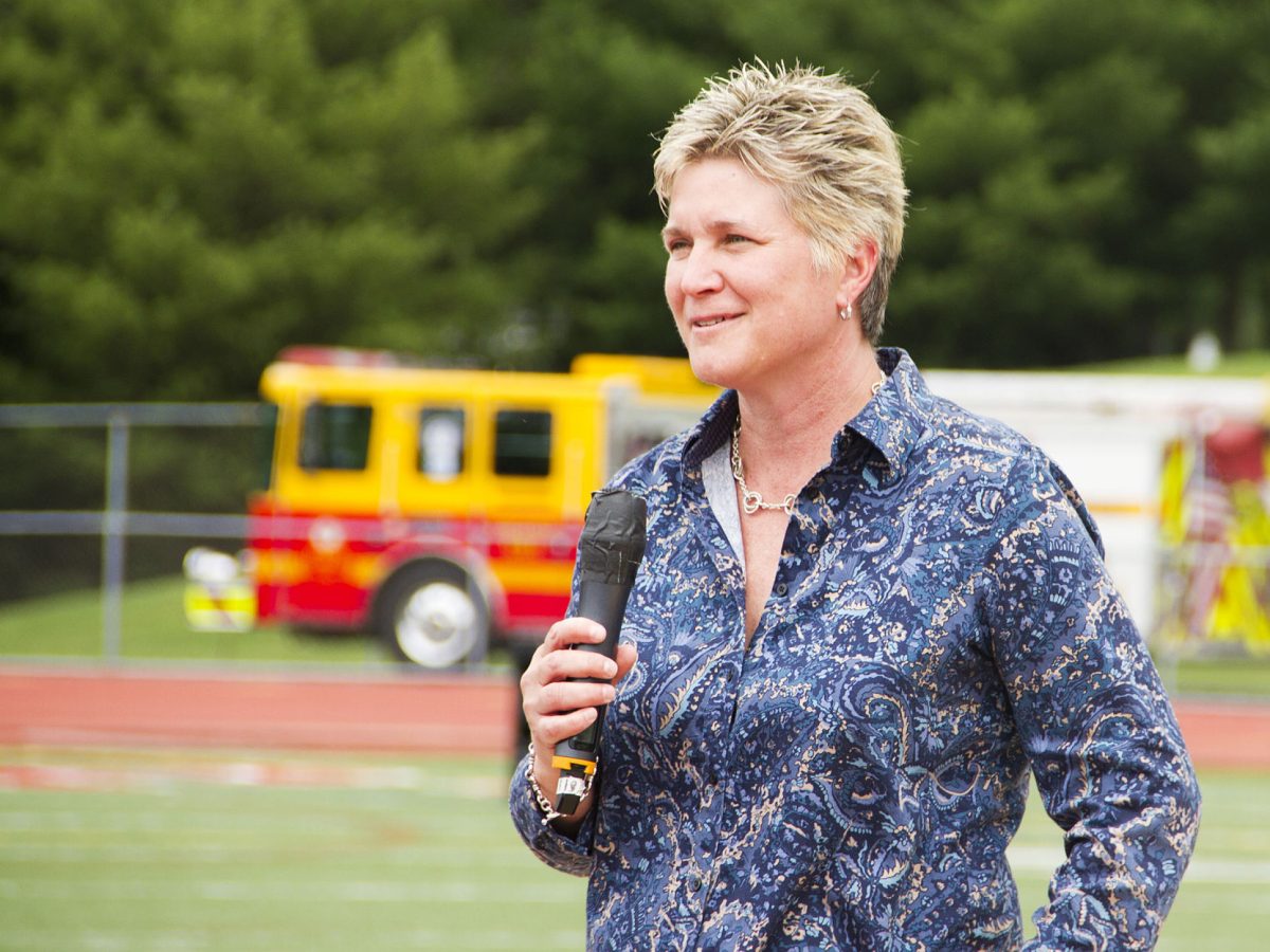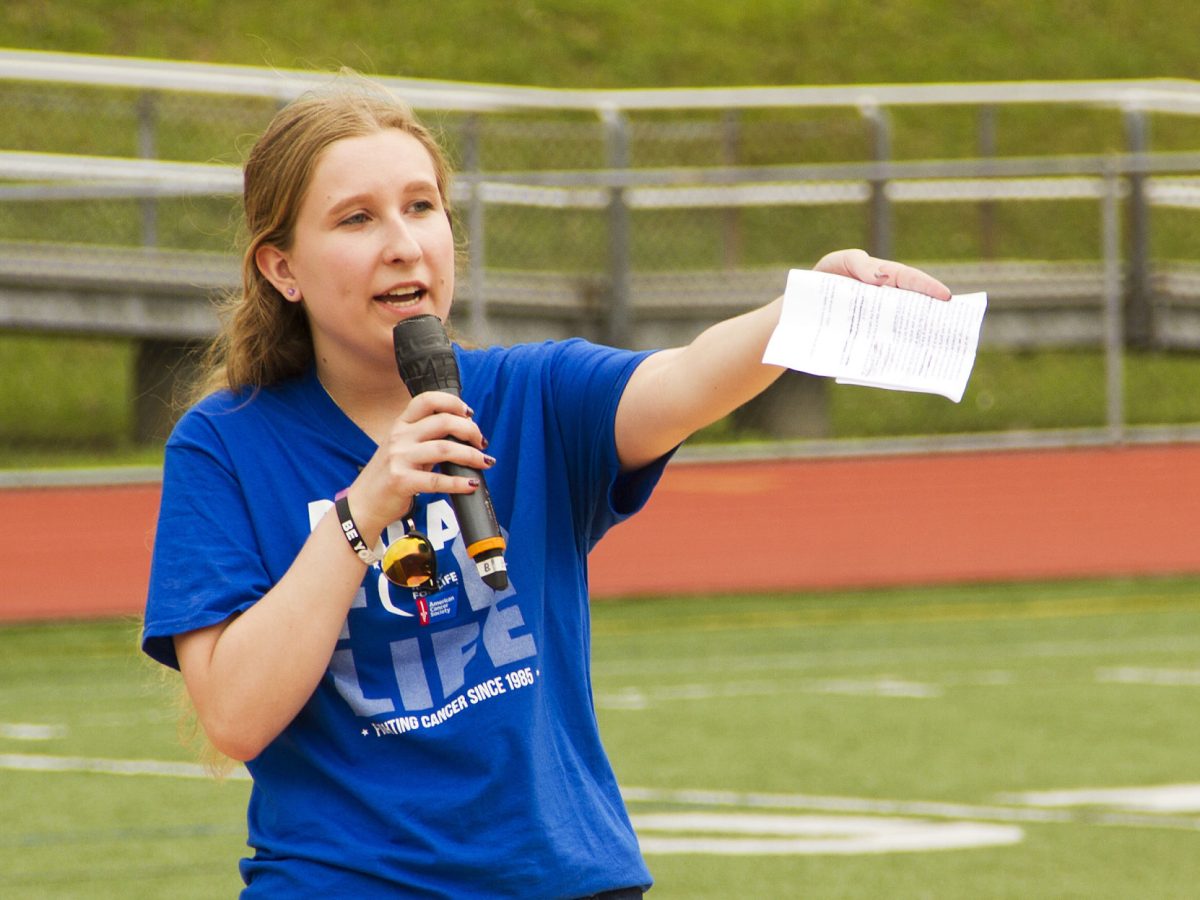 Co-event leader Ashley Meisel greets participants to kick off the Relay for Life.