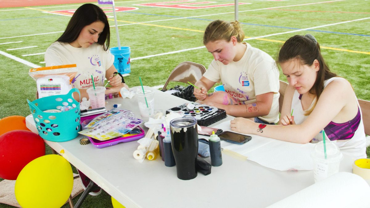 Decorating themselves at a Relay for Life act activity booth are, from left, Lilly Goris, Allie Orphall and Jackie Thomas.