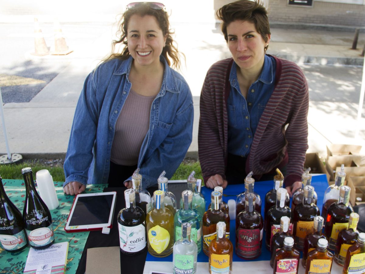 Representing Wigle Whiskey at the Mt. Lebanon Uptown Market, Hannah Rauch, left, and Ali Greenholt offer a variety of somethings to wet yer whistle.