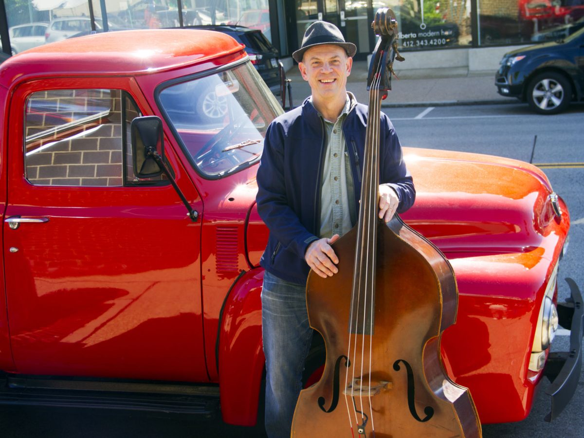 During a performance break, Dave Glasser displays his 1955 upright bass in front of a Ford F-100 that also happens to be from ’55.