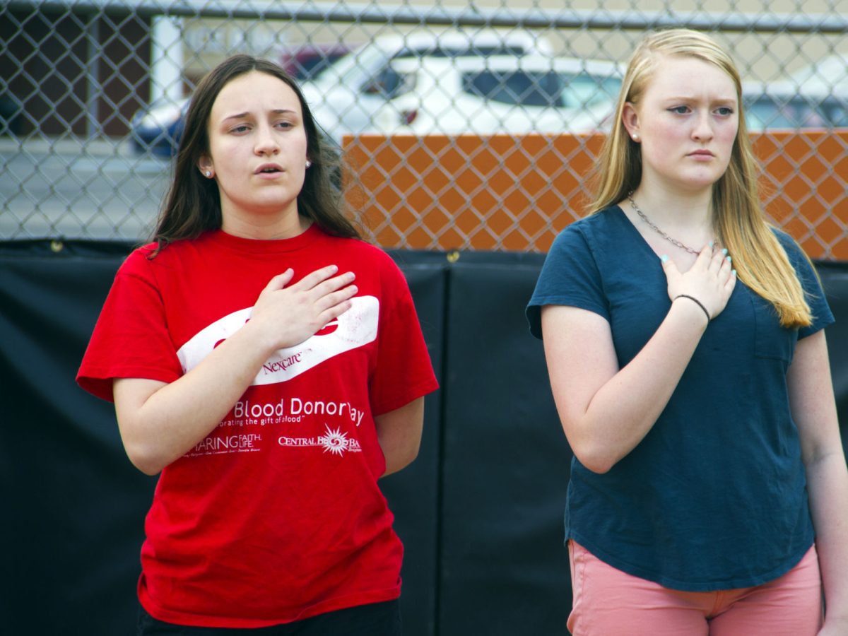 Madicyn Nicklas, left, and Grace Fabian sing “The Star-Spangled Banner” prior to the baseball game.