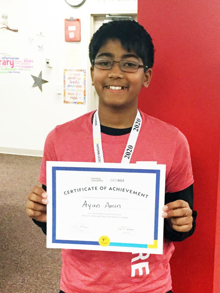 • Boyce Middle School sixth-grader Ayan Amin was named among 100 semifinalists eligible to compete in the 2020 National Geographic GeoBee state-level competition for Pennsylvania.
