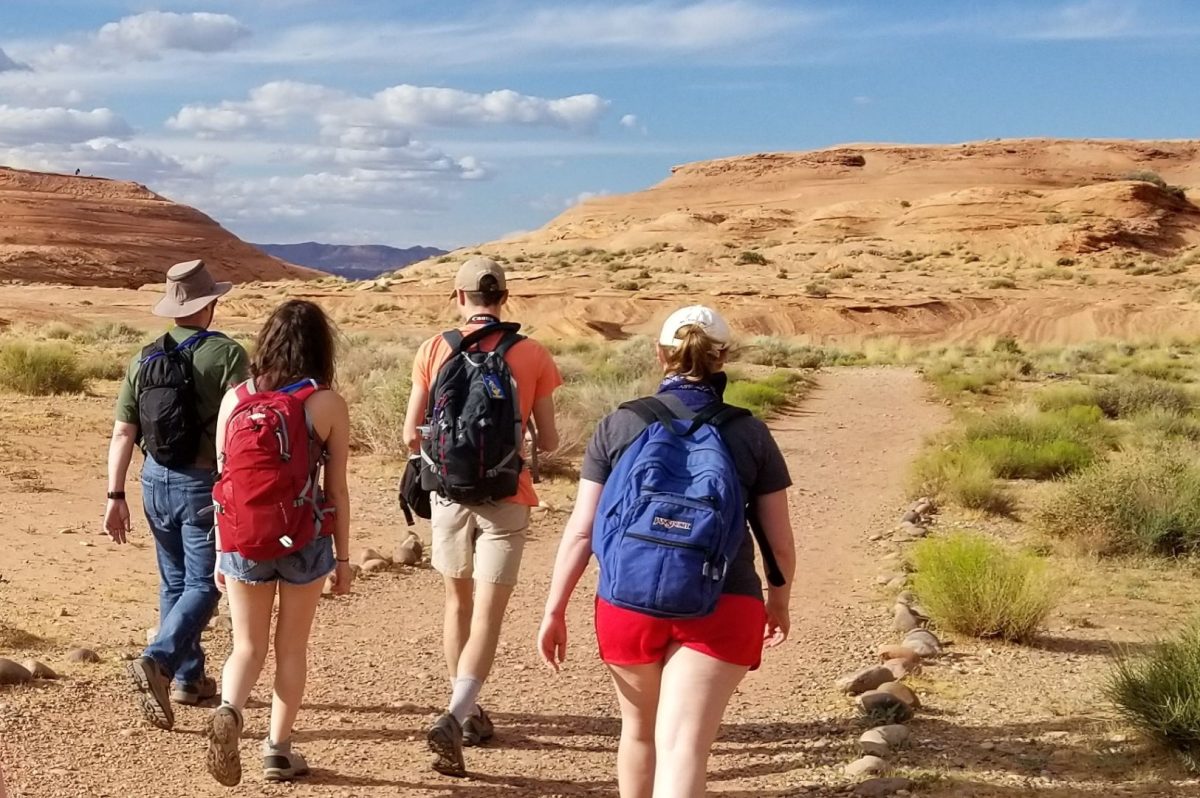 Sam Fee, far left, leads a group of alumni from Washington & Jefferson College on a hiking trail in Page, Ariz.