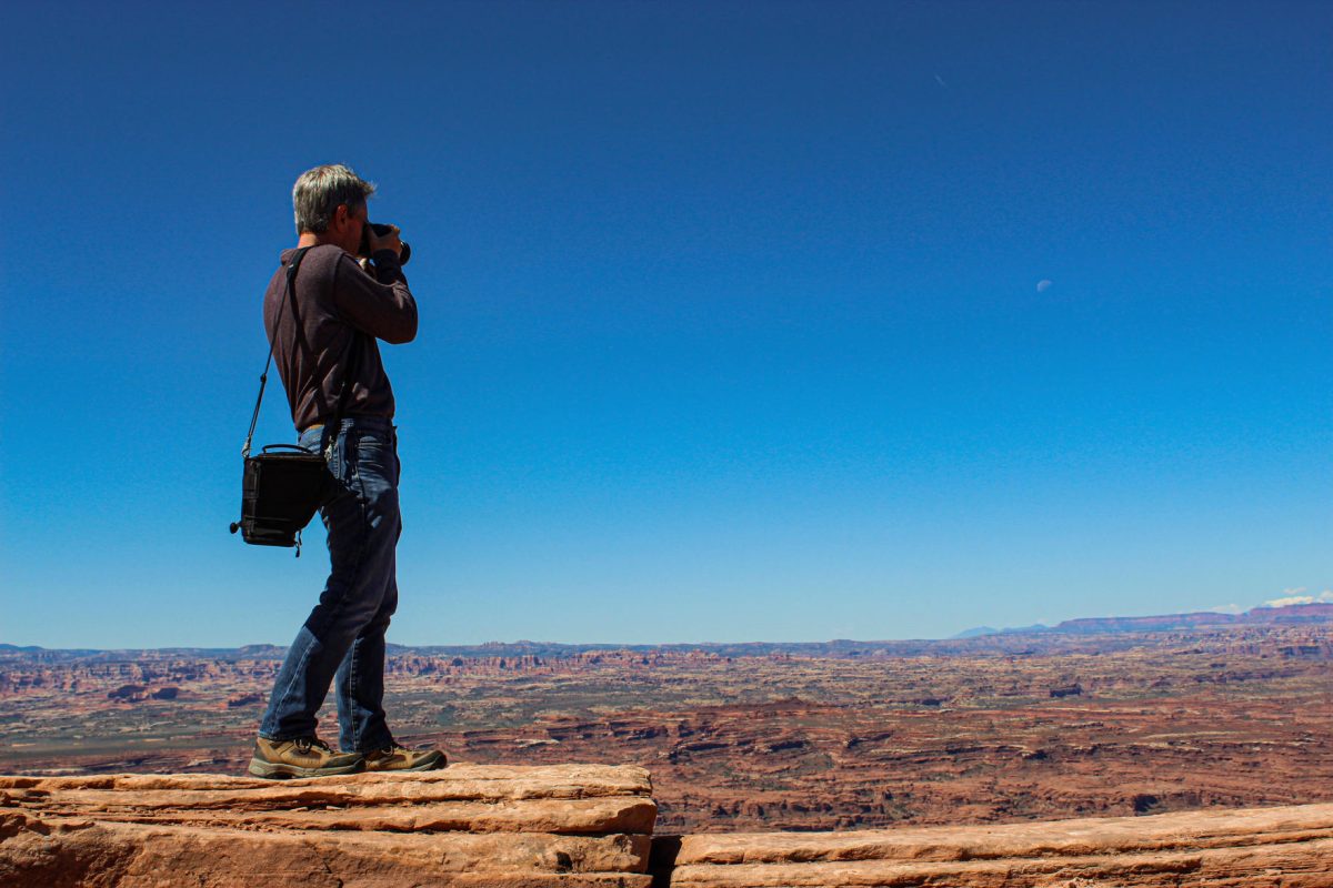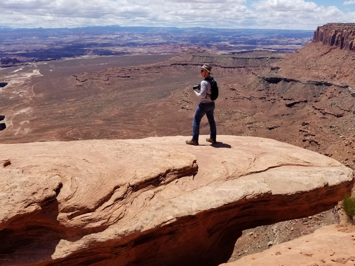 Sam Fee scans the horizon from his perch on Island in the Sky overlook at Cayonlands National Park in Utah during a trip to the southwest in May.