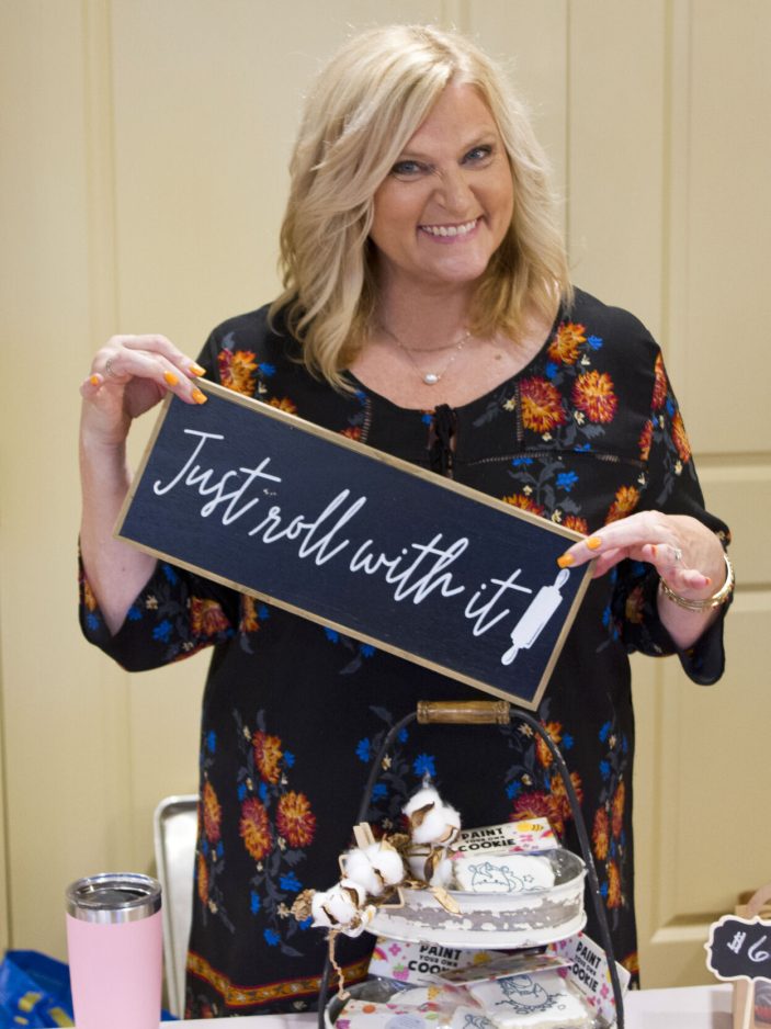 Rita Abbio displays the catchy slogan for Cookie Wishes, a small business specializing in designer, high quality custom cookies for all events.