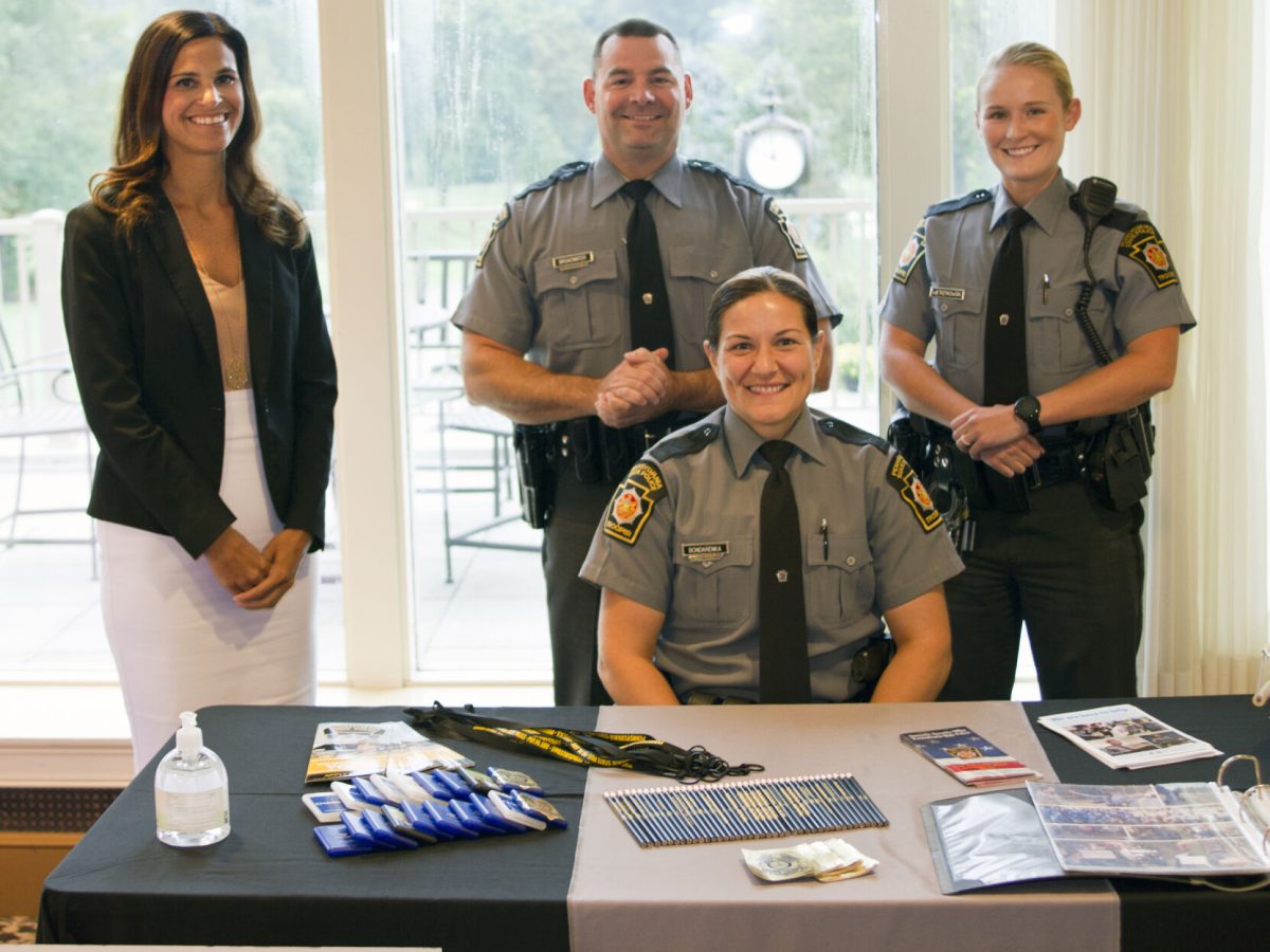 State Rep. Natalie Mihalek, R-Peters Township, who organzed the Women’s Expo, greets Pennsylvania State Police troopers, from left, Robert Broadwater, Melinda Bondarenka and Kalee Wietrzykowski.