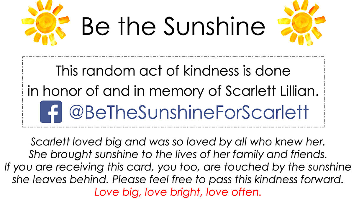 Ryan and Stephanie Pauley encourage those who are either givers or recipients to share their experiences at www.facebook.com/bethesunshineforscarlett, where Sunshine cards to hand out are available to download and print.