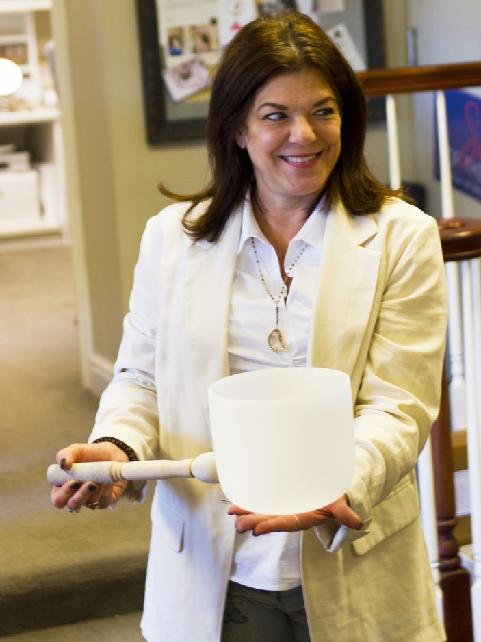 Lisa Mascara demonstrates the sound made by a therapeutic singing bowl.