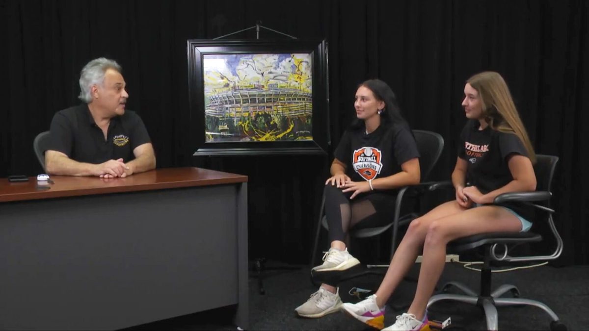 On BPTV’s “Pittsburgh Sportsline,” Al Levine interviews Bethel Park High School softball players Sandra Soltes, left, and Delaney Sierka. Sandra drove in eight runs in the WPIAL Class 6A championship game.