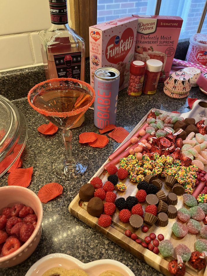 Last weekend, Carbert showed her two best gal pals some love at a Galentine’s Day soiree. The women dressed to the Galentine’s nines in traditional pinks, reds and whites and enjoyed an afternoon of chatting over pink bubbly, baking Funfetti cupcakes and grazing on candy charcuterie, heart-shaped fruits, meats and cheeses, and heart-shaped chicken nuggets.