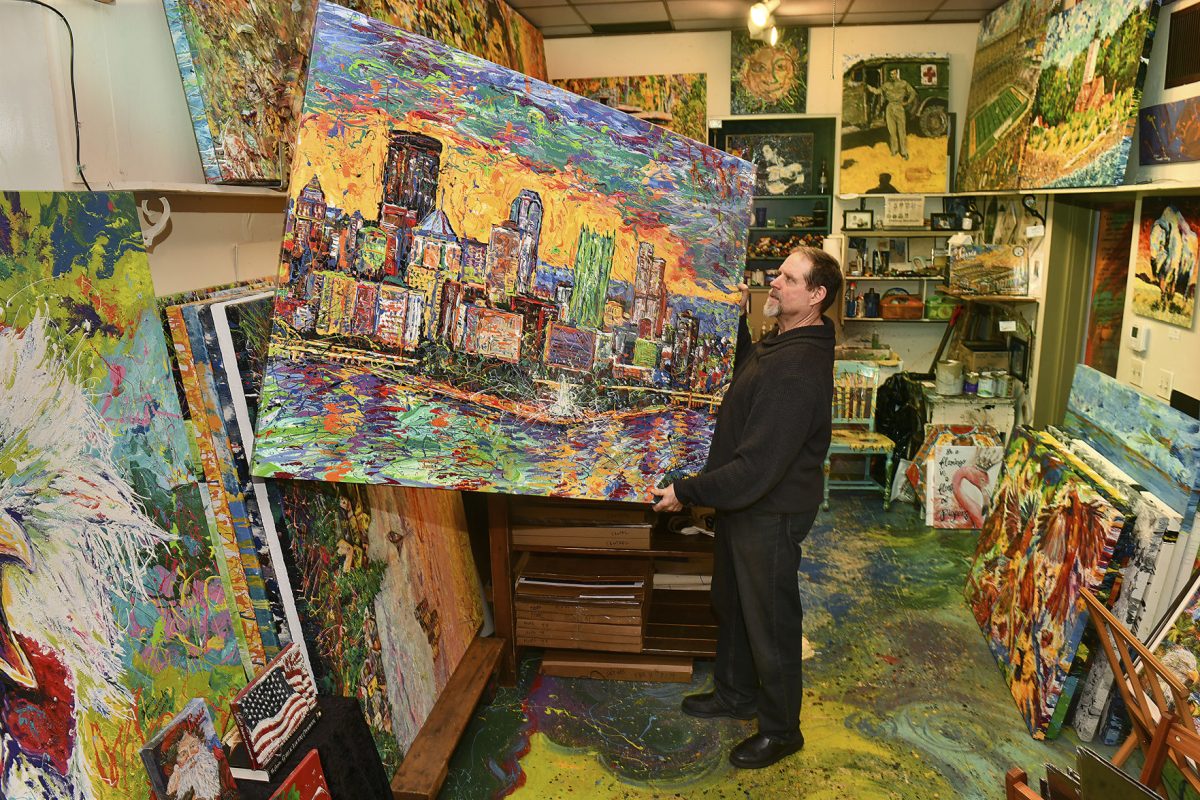 They’re all different, “Houses on the Hill,” for example, I thought about that painting for over a year. I wanted to take a little chunk of the South Side Slopes – there are thousands of houses on the Slopes, but there are only about 200 in this painting, which is a lot. So I took multiple pictures – my work is all original. I knew I wanted it to be 4 feet by 5 feet and that actually took me three months to paint. Usually my paintings take six weeks to two months, but that’s ok, there are no rules with me. I didn’t want to put any cars or people in the painting. We know it’s Pittsburgh, but really it could be European or it could be somewhere else. And I’ve had that out since last May and we’ve gotten a great response. My wife and I, we live on top of the Slopes and my studio is right here, so it’s kind of down below me. Other ones come to me in a dream, I write it down, and I start doing it. I do some commissions now and then, a lot of times I just paint – I love to paint my passions and it’s worked out well. I can draw, but it takes me a long time to draw so I do very minimal drawing or none at all. It would take me longer to sketch it than it would to paint it – that’s just how it works for me.