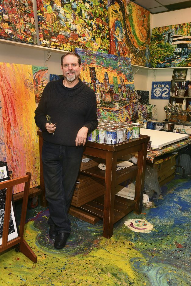 Today, married to fellow artist Maria DeSimone, his colorful works that incorporate enamel paint with sand lifted from the beds of the Monongahela River have not only given him local notariety, but put him on the map all over the world. He’s formed partnerships with KDKA, Fallingwater, Sarris, the Pittsburgh Steelers, and more. He’s worked with many local charities, which have auctioned off his works to raise funds.