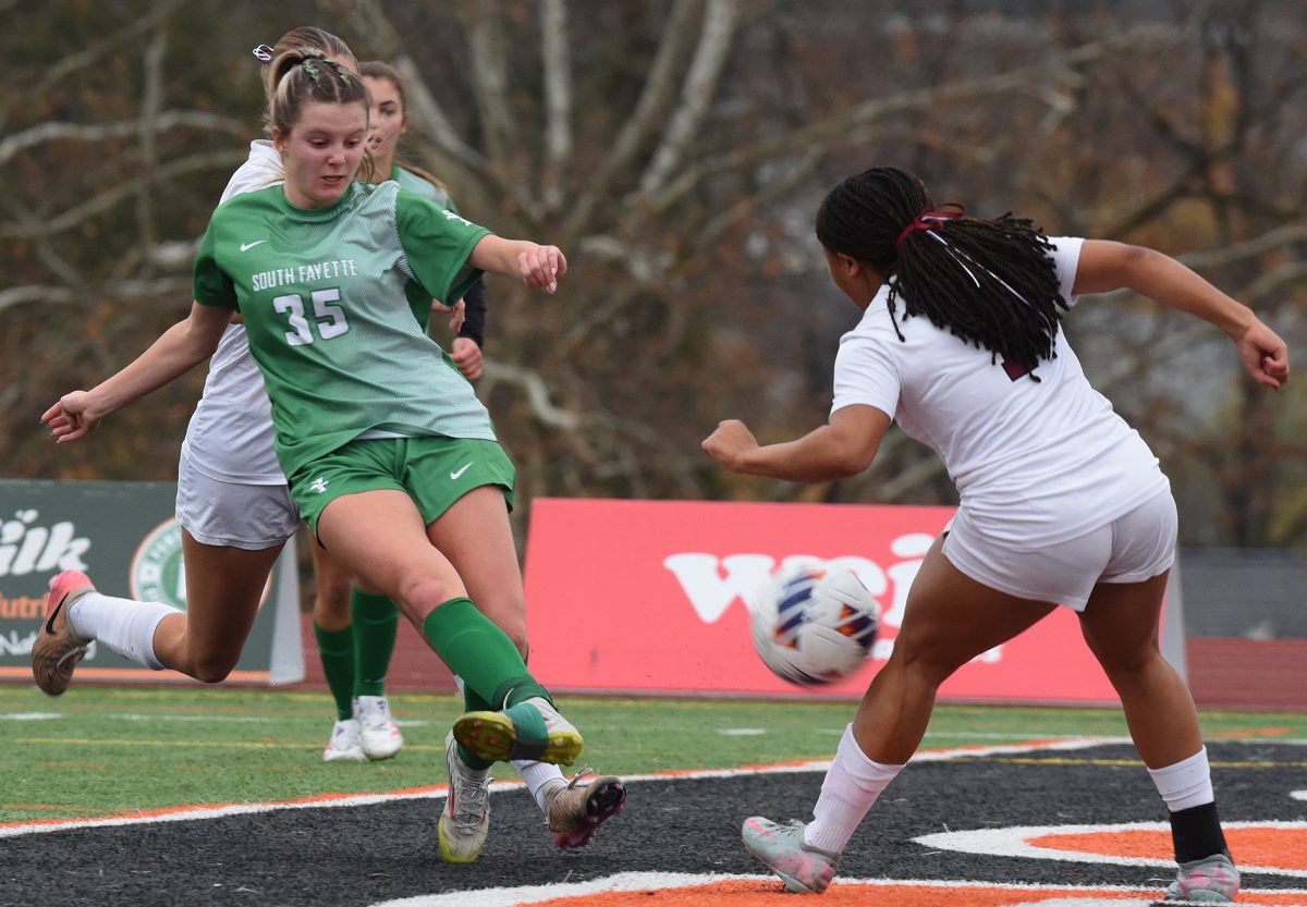 At that point, Gabby Beinecke was tackled in the box, near the left side of the end line, and South Fayette was awarded a penalty kick. Abbey Spalla converted the shot to tie the match, 1-1.