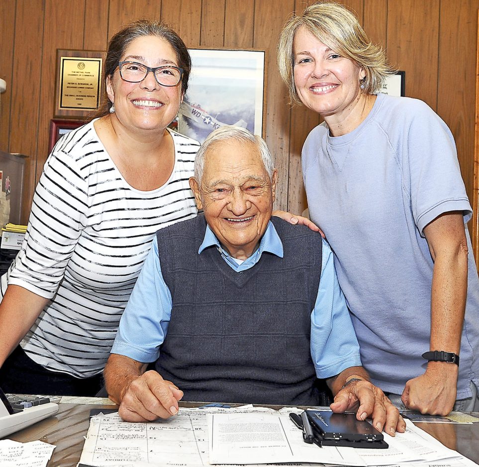 Peter Edwards, Jr. works with Diana Lewandowski, left, and Hayden Norman at Brookside Lumber. Edwards is the chairman of the company located in Bethel Park and the Peters Township resident puts in a full day of work even today at the age of 97.