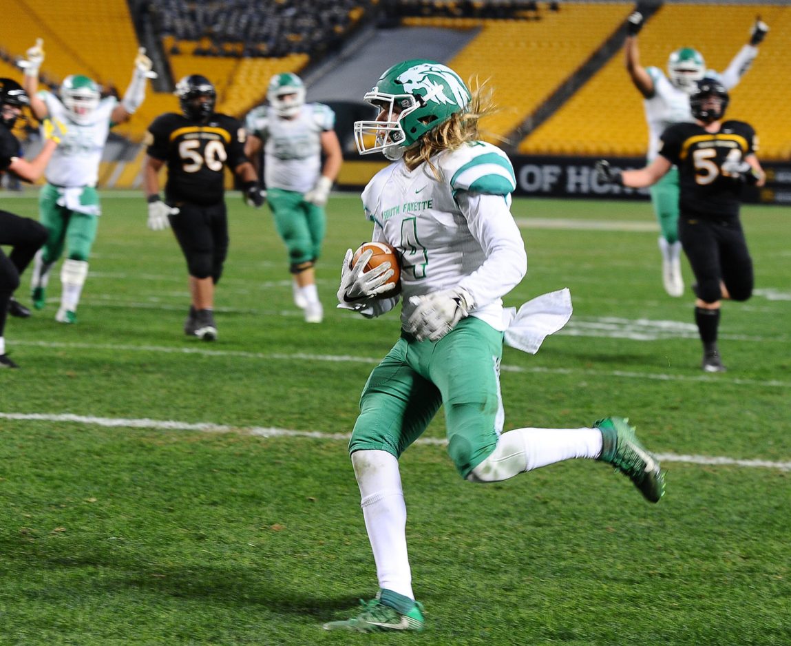 South Fayette players in the background celebrate as Mike Trimbur crossed the goal line with his second TD catch in the WPIAL championship game. The Cornell recruit had five receptions for 138 yards in a 31-24 win against Thomas Jefferson. In addition to TD receptions of 82 and 10 yards, Trimbur intercepted a pass on defense to seal SF’s victory.