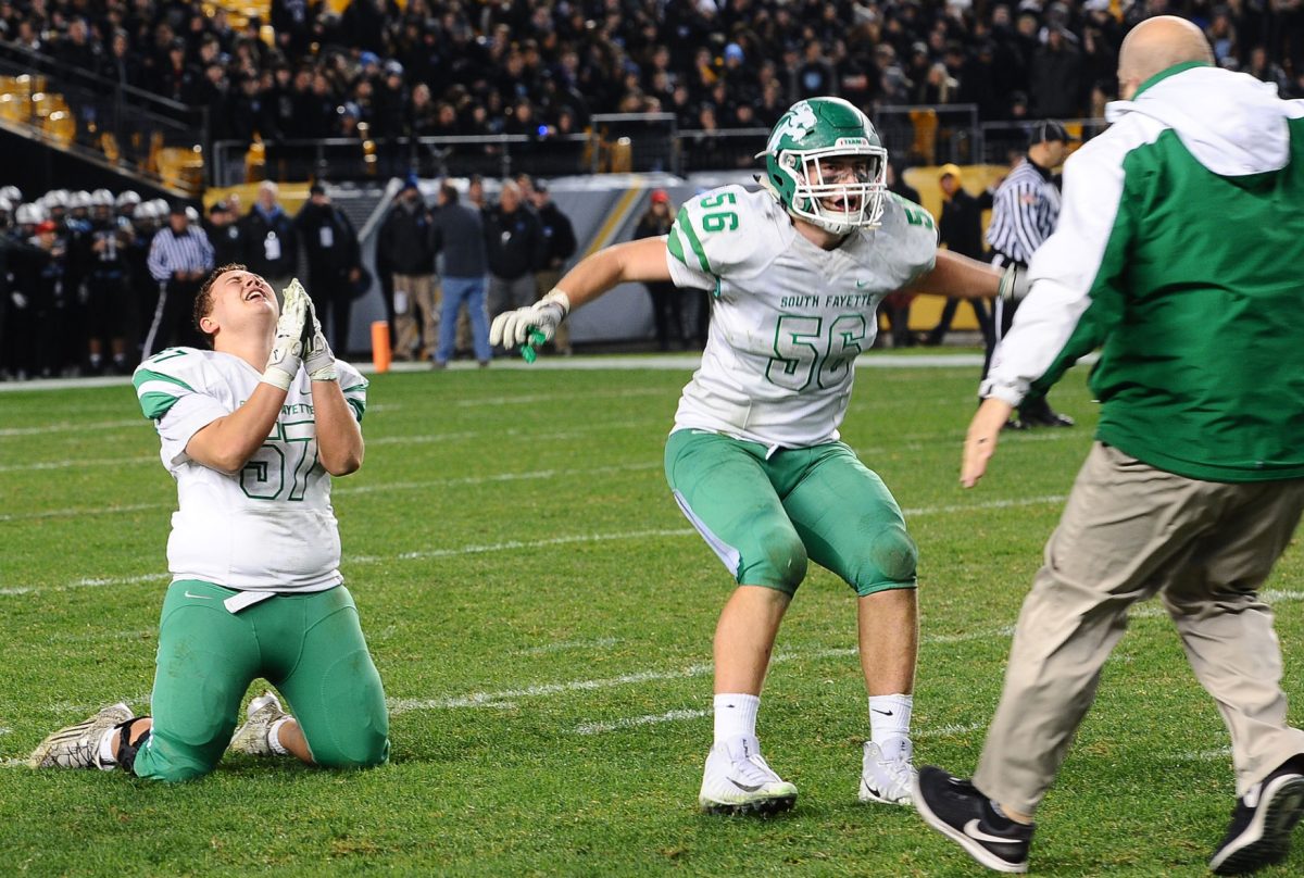 Jaelin Krocker (57) gives thanks for South Fayette’s WPIAL championship win over Thomas Jefferson, 31-24, as Ben Coyne (No. 56) prepares to jump into the arms of an assistant coach.